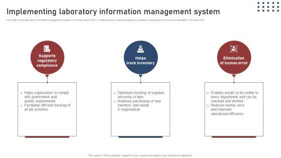 This slide covers laboratory information management system. It involves need of LMS in healthcare as it supports regulatory compliance, helps track inventory and elimination of human error. Make sure to capture your audiences attention in your business displays with our gratis customizable Implementing Laboratory Transforming Medical Workflows Via His Integration Infographics Pdf. These are great for business strategies, office conferences, capital raising or task suggestions. If you desire to acquire more customers for your tech business and ensure they stay satisfied, create your own sales presentation with these plain slides. This slide covers laboratory information management system. It involves need of LMS in healthcare as it supports regulatory compliance, helps track inventory and elimination of human error.