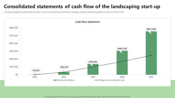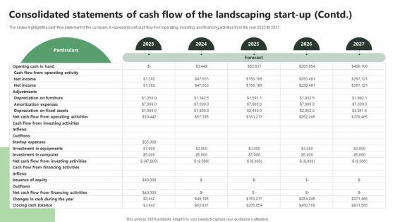 The slides highlight the cash flow statement of the company. It represents net cash flow from operating, investing, and financing activities from the year 2023 till 2027. There are so many reasons you need a Consolidated Statements Of Cash Flow Of The Landscaping Start Up Lawn Care BP SS V. The first reason is you can not spend time making everything from scratch, Thus, Slidegeeks has made presentation templates for you too. You can easily download these templates from our website easily. The slides highlight the cash flow statement of the company. It represents net cash flow from operating, investing, and financing activities from the year 2023 till 2027.