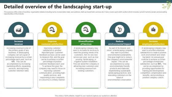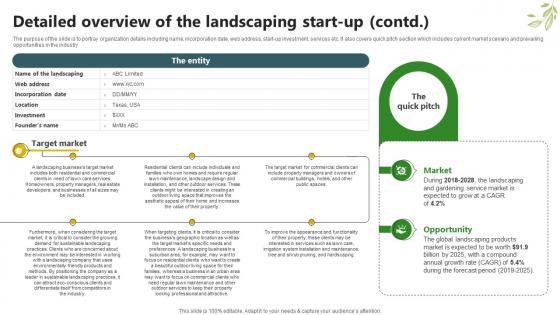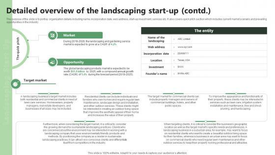 The purpose of the slide is to portray organization details including name, incorporation date, web address, start-up investment, services etc. It also covers quick pitch section which includes current market scenario and prevailing opportunities in the industry. From laying roadmaps to briefing everything in detail, our templates are perfect for you. You can set the stage with your presentation slides. All you have to do is download these easy-to-edit and customizable templates. Detailed Overview Of The Landscaping Start Up Lawn Care BP SS V will help you deliver an outstanding performance that everyone would remember and praise you for. Do download this presentation today. The purpose of the slide is to portray organization details including name, incorporation date, web address, start-up investment, services etc. It also covers quick pitch section which includes current market scenario and prevailing opportunities in the industry.
