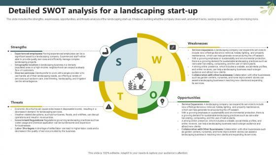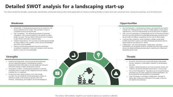 The slide includes the strengths, weaknesses, opportunities, and threats analysis of the landscaping start-up. It helps in building what the company does well, and what it lacks, seizing new openings, and minimizing risks. Present like a pro with Detailed Swot Analysis For A Landscaping Start Up Lawn Care BP SS V. Create beautiful presentations together with your team, using our easy-to-use presentation slides. Share your ideas in real-time and make changes on the fly by downloading our templates. So whether you are in the office, on the go, or in a remote location, you can stay in sync with your team and present your ideas with confidence. With Slidegeeks presentation got a whole lot easier. Grab these presentations today. The slide includes the strengths, weaknesses, opportunities, and threats analysis of the landscaping start-up. It helps in building what the company does well, and what it lacks, seizing new openings, and minimizing risks.