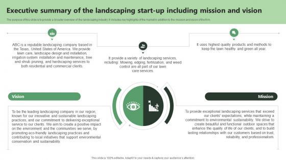 The purpose of this slide is to provide a broader overview of the landscaping industry. It includes key highlights of the market in addition to the mission and vision of the firm. If you are looking for a format to display your unique thoughts, then the professionally designed Executive Summary Of The Landscaping Start Up Including Lawn Care BP SS V is the one for you. You can use it as a Google Slides template or a PowerPoint template. Incorporate impressive visuals, symbols, images, and other charts. Modify or reorganize the text boxes as you desire. Experiment with shade schemes and font pairings. Alter, share or cooperate with other people on your work. Download Executive Summary Of The Landscaping Start Up Including Lawn Care BP SS V and find out how to give a successful presentation. Present a perfect display to your team and make your presentation unforgettable. The purpose of this slide is to provide a broader overview of the landscaping industry. It includes key highlights of the market in addition to the mission and vision of the firm.