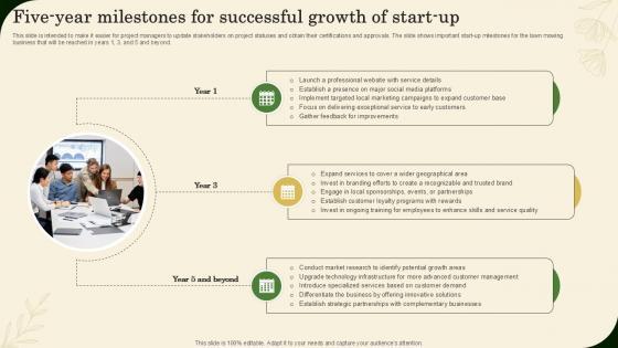 This slide is intended to make it easier for project managers to update stakeholders on project statuses and obtain their certifications and approvals. The slide shows important start-up milestones for the lawn mowing business that will be reached in years 1, 3, and 5 and beyond. If your project calls for a presentation, then Slidegeeks is your go-to partner because we have professionally designed, easy-to-edit templates that are perfect for any presentation. After downloading, you can easily edit Five Year Milestones For Successful Growth Of Start Up Landscaping Business Plan Ppt Slide BP SS V and make the changes accordingly. You can rearrange slides or fill them with different images. Check out all the handy templates This slide is intended to make it easier for project managers to update stakeholders on project statuses and obtain their certifications and approvals. The slide shows important start-up milestones for the lawn mowing business that will be reached in years 1, 3, and 5 and beyond.