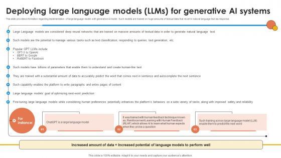 This slide provides information regarding implementation of large language model with generative AI model. Such models are trained on huge amounts of textual data that revert in natural language text as response. Do you have an important presentation coming up Are you looking for something that will make your presentation stand out from the rest Look no further than Deploying Large Language Models LLMs Generative AI For Better Productivity AI SS V. With our professional designs, you can trust that your presentation will pop and make delivering it a smooth process. And with Slidegeeks, you can trust that your presentation will be unique and memorable. So why wait Grab Deploying Large Language Models LLMs Generative AI For Better Productivity AI SS V today and make your presentation stand out from the rest This slide provides information regarding implementation of large language model with generative AI model. Such models are trained on huge amounts of textual data that revert in natural language text as response.