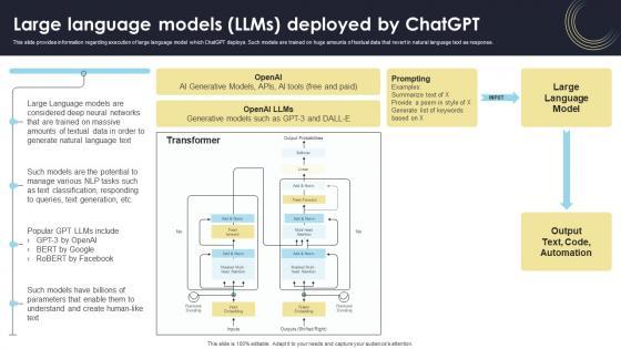 This slide provides information regarding execution of large language model which ChatGPT deploys. Such models are trained on huge amounts of textual data that revert in natural language text as response. Get a simple yet stunning designed Large Language Models Llms Deployed By ChatGPT How Generative AI Tools Work AI SS V. It is the best one to establish the tone in your meetings. It is an excellent way to make your presentations highly effective. So, download this PPT today from Slidegeeks and see the positive impacts. Our easy-to-edit Large Language Models Llms Deployed By ChatGPT How Generative AI Tools Work AI SS V can be your go-to option for all upcoming conferences and meetings. So, what are you waiting for Grab this template today. This slide provides information regarding execution of large language model which ChatGPT deploys. Such models are trained on huge amounts of textual data that revert in natural language text as response.
