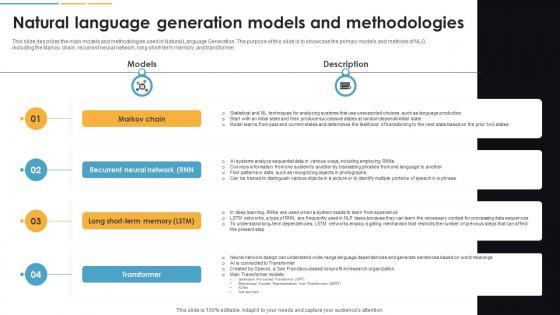 This slide describes the main models and methodologies used in Natural Language Generation. The purpose of this slide is to showcase the primary models and methods of NLG, including the Markov chain, recurrent neural network, long short-term memory, and transformer. Find a pre-designed and impeccable Natural Language Generation Models And Methodologies Natural Language Automation. The templates can ace your presentation without additional effort. You can download these easy-to-edit presentation templates to make your presentation stand out from others. So, what are you waiting for Download the template from Slidegeeks today and give a unique touch to your presentation. This slide describes the main models and methodologies used in Natural Language Generation. The purpose of this slide is to showcase the primary models and methods of NLG, including the Markov chain, recurrent neural network, long short-term memory, and transformer.