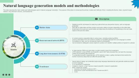 This slide describes the main models and methodologies used in Natural Language Generation. The purpose of this slide is to showcase the primary models and methods of NLG, including the Markov chain, recurrent neural network, long short-term memory, and transformer. Find a pre-designed and impeccable Natural Language Generation Models And Methodologies PPT PowerPoint. The templates can ace your presentation without additional effort. You can download these easy-to-edit presentation templates to make your presentation stand out from others. So, what are you waiting for Download the template from Slidegeeks today and give a unique touch to your presentation. This slide describes the main models and methodologies used in Natural Language Generation. The purpose of this slide is to showcase the primary models and methods of NLG, including the Markov chain, recurrent neural network, long short-term memory, and transformer.