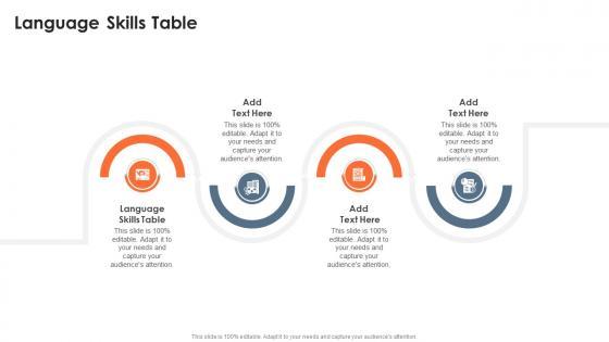 Presenting our innovatively designed set of slides titled Language Skills Table In Powerpoint And Google Slides Cpb. This completely editable PowerPoint graphic exhibits Language Skills Table that will help you convey the message impactfully. It can be accessed with Google Slides and is available in both standard screen and widescreen aspect ratios. Apart from this, you can download this well-structured PowerPoint template design in different formats like PDF, JPG, and PNG. So, click the download button now to gain full access to this PPT design. Our Language Skills Table In Powerpoint And Google Slides Cpb are topically designed to provide an attractive backdrop to any subject. Use them to look like a presentation pro.