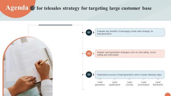 Create an editable Agenda For Telesales Strategy For Targeting Large Customer Base Strategy SS V that communicates your idea and engages your audience. Whether you are presenting a business or an educational presentation, pre-designed presentation templates help save time. Agenda For Telesales Strategy For Targeting Large Customer Base Strategy SS V is highly customizable and very easy to edit, covering many different styles from creative to business presentations. Slidegeeks has creative team members who have crafted amazing templates. So, go and get them without any delay. Our Agenda For Telesales Strategy For Targeting Large Customer Base Strategy SS V are topically designed to provide an attractive backdrop to any subject. Use them to look like a presentation pro.