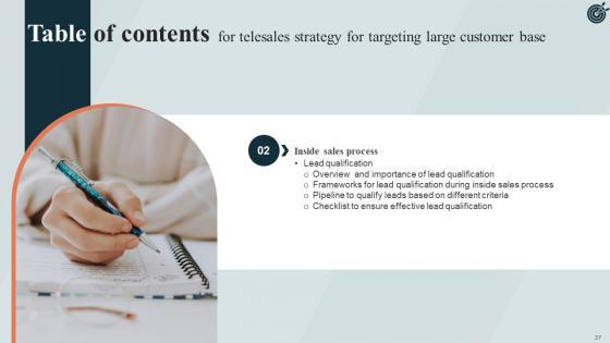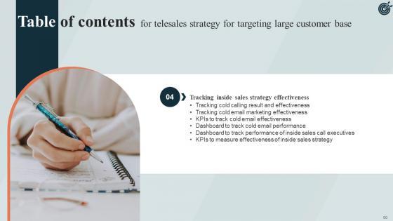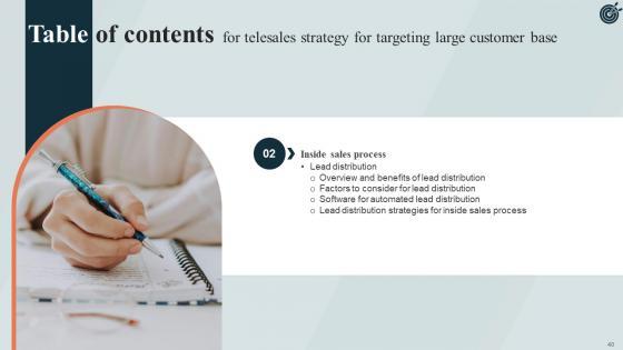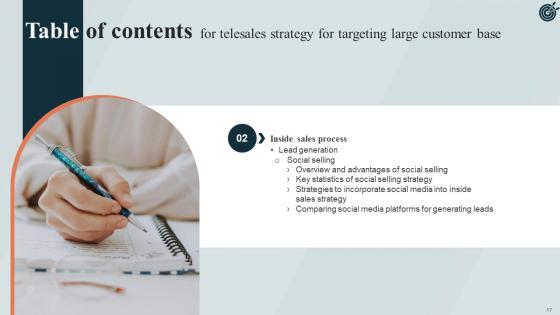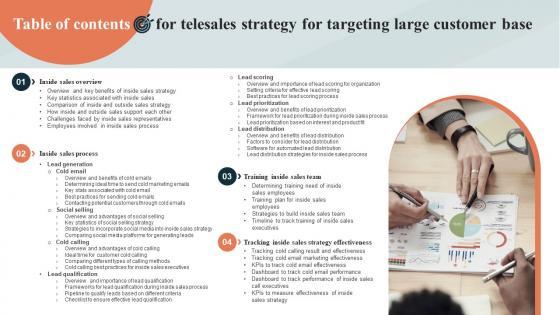 Want to ace your presentation in front of a live audience Our Table Of Contents For Telesales Strategy For Targeting Large Customer Base Strategy SS V can help you do that by engaging all the users towards you. Slidegeeks experts have put their efforts and expertise into creating these impeccable powerpoint presentations so that you can communicate your ideas clearly. Moreover, all the templates are customizable, and easy-to-edit and downloadable. Use these for both personal and commercial use. Our Table Of Contents For Telesales Strategy For Targeting Large Customer Base Strategy SS V are topically designed to provide an attractive backdrop to any subject. Use them to look like a presentation pro.