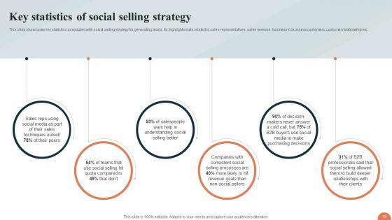 This slide showcases key statistics associated with social selling strategy for generating leads. Its highlights stats related to sales representatives, sales revenue, business to business customers, customer relationship etc. The Telesales Strategy For Targeting Large Customer Key Statistics Of Social Selling Strategy SS V is a compilation of the most recent design trends as a series of slides. It is suitable for any subject or industry presentation, containing attractive visuals and photo spots for businesses to clearly express their messages. This template contains a variety of slides for the user to input data, such as structures to contrast two elements, bullet points, and slides for written information. Slidegeeks is prepared to create an impression. This slide showcases key statistics associated with social selling strategy for generating leads. Its highlights stats related to sales representatives, sales revenue, business to business customers, customer relationship etc.