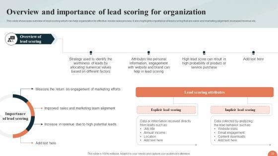 This slide showcases overview of lead scoring which can help organization for effective inside sales process. It also highlights importance of lead scoring that are sales and marketing alignment, increased revenue etc. Boost your pitch with our creative A12 Telesales Strategy For Targeting Large Customer Base Overview And Importance Strategy SS V. Deliver an awe-inspiring pitch that will mesmerize everyone. Using these presentation templates you will surely catch everyones attention. You can browse the ppts collection on our website. We have researchers who are experts at creating the right content for the templates. So you do not have to invest time in any additional work. Just grab the template now and use them. This slide showcases overview of lead scoring which can help organization for effective inside sales process. It also highlights importance of lead scoring that are sales and marketing alignment, increased revenue etc.