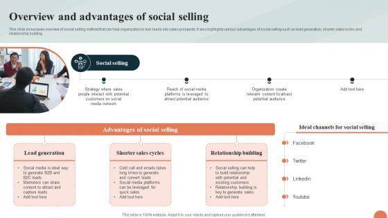 This slide showcases overview of social selling method that can help organization to turn leads into sales prospects. It also highlights various advantages of social selling such as lead generation, shorter sales cycles and relationship building. Are you searching for a Telesales Strategy For Targeting Large Customer Overview And Advantages Of Social Strategy SS V that is uncluttered, straightforward, and original Its easy to edit, and you can change the colors to suit your personal or business branding. For a presentation that expresses how much effort you have put in, this template is ideal With all of its features, including tables, diagrams, statistics, and lists, its perfect for a business plan presentation. Make your ideas more appealing with these professional slides. Download Telesales Strategy For Targeting Large Customer Overview And Advantages Of Social Strategy SS V from Slidegeeks today. This slide showcases overview of social selling method that can help organization to turn leads into sales prospects. It also highlights various advantages of social selling such as lead generation, shorter sales cycles and relationship building.