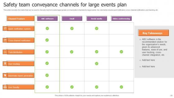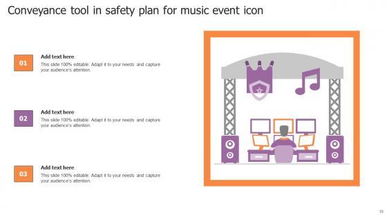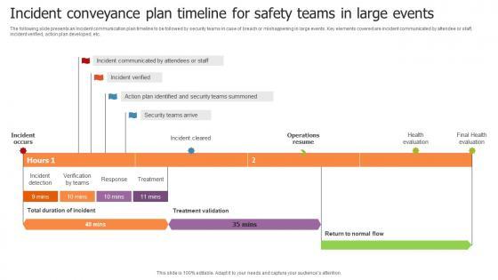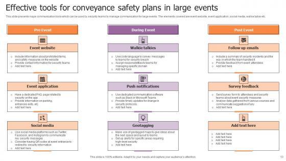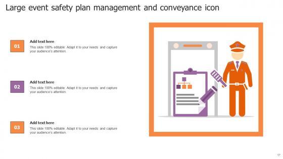 Share a great deal of information on the topic by deploying this Conveyance In Safety Plan For Large Events Ppt Powerpoint Presentation Complete Deck With Slides. Support your ideas and thought process with this prefabricated set. It includes a set of twenty one slides, all fully modifiable and editable. Each slide can be restructured and induced with the information and content of your choice. You can add or remove large content boxes as well, to make this PPT slideshow more personalized. Its high-quality graphics and visuals help in presenting a well-coordinated pitch. This PPT template is also a resourceful tool to take visual cues from and implement the best ideas to help your business grow and expand. The main attraction of this well-formulated deck is that everything is editable, giving you the freedom to adjust it to your liking and choice. Changes can be made in the background and theme as well to deliver an outstanding pitch. Therefore, click on the download button now to gain full access to this multifunctional set. Our Conveyance In Safety Plan For Large Events Ppt Powerpoint Presentation Complete Deck With Slides are topically designed to provide an attractive backdrop to any subject. Use them to look like a presentation pro.