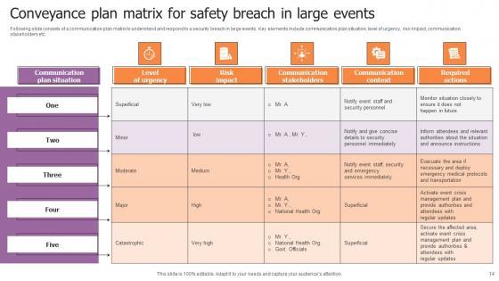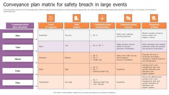 Following slide consists of a communication plan matrix to understand and respond to a security breach in large events. Key elements include communication plan situation, level of urgency, risk impact, communication stakeholders etc. Pitch your topic with ease and precision using this Conveyance Plan Matrix For Safety Breach In Large Events Diagrams Pdf. This layout presents information on Level Of Urgency, Risk Impact, Communication Stakeholders. It is also available for immediate download and adjustment. So, changes can be made in the color, design, graphics or any other component to create a unique layout. Following slide consists of a communication plan matrix to understand and respond to a security breach in large events. Key elements include communication plan situation, level of urgency, risk impact, communication stakeholders etc.
