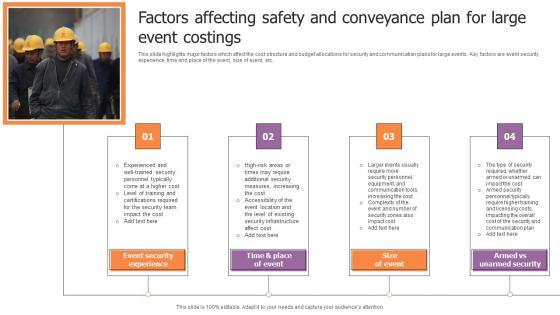 This slide highlights major factors which affect the cost structure and budget allocations for security and communication plans for large events. Key factors are event security experience, time and place of the event, size of event, etc. Pitch your topic with ease and precision using this Factors Affecting Safety And Conveyance Plan For Large Event Costings Pictures Pdf. This layout presents information on Event Security Experience, Size Of Event, Armed Vs Unarmed Security. It is also available for immediate download and adjustment. So, changes can be made in the color, design, graphics or any other component to create a unique layout. This slide highlights major factors which affect the cost structure and budget allocations for security and communication plans for large events. Key factors are event security experience, time and place of the event, size of event, etc.