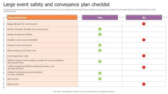 The following slide presents a security and communication plan checklist to be used by managers for checking the status of activities in large event. Key initiatives include budget allocation, number of attendees, seating arrangements etc. Pitch your topic with ease and precision using this Large Event Safety And Conveyance Plan Checklist Portrait Pdf. This layout presents information on Key Initiatives, Safety And Conveyance. It is also available for immediate download and adjustment. So, changes can be made in the color, design, graphics or any other component to create a unique layout. The following slide presents a security and communication plan checklist to be used by managers for checking the status of activities in large event. Key initiatives include budget allocation, number of attendees, seating arrangements etc.