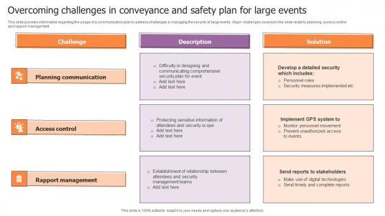 This slide provides information regarding the usage of a communication plan to address challenges in managing the security of large events. Major challenges covered in the slide relate to planning, access control and rapport management. Pitch your topic with ease and precision using this Overcoming Challenges In Conveyance And Safety Plan For Large Events Clipart Pdf. This layout presents information on Planning Communication, Access Control, Rapport Management. It is also available for immediate download and adjustment. So, changes can be made in the color, design, graphics or any other component to create a unique layout. This slide provides information regarding the usage of a communication plan to address challenges in managing the security of large events. Major challenges covered in the slide relate to planning, access control and rapport management.