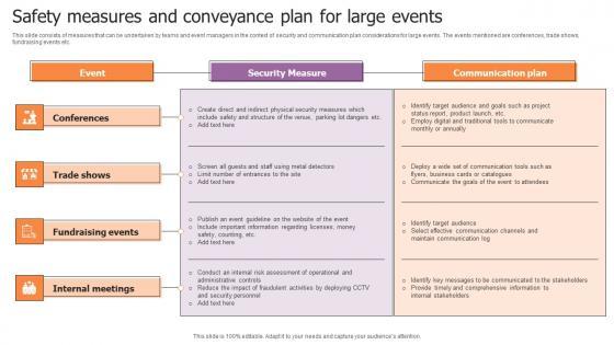 This slide consists of measures that can be undertaken by teams and event managers in the context of security and communication plan considerations for large events. The events mentioned are conferences, trade shows, fundraising events etc. Pitch your topic with ease and precision using this Safety Measures And Conveyance Plan For Large Events Designs Pdf. This layout presents information on Conferences, Trade Shows, Fundraising Events. It is also available for immediate download and adjustment. So, changes can be made in the color, design, graphics or any other component to create a unique layout. This slide consists of measures that can be undertaken by teams and event managers in the context of security and communication plan considerations for large events. The events mentioned are conferences, trade shows, fundraising events etc.