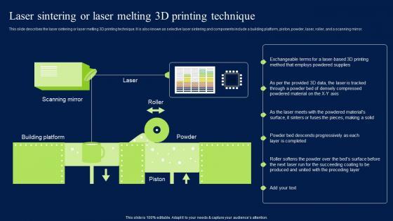 This slide describes the laser sintering or laser melting 3D printing technique. It is also known as selective laser sintering and components include a building platform, piston, powder, laser, roller, and a scanning mirror. Explore a selection of the finest Laser Sintering Or Laser Melting 3D Printing Technique Rules PDF here. With a plethora of professionally designed and pre-made slide templates, you can quickly and easily find the right one for your upcoming presentation. You can use our Laser Sintering Or Laser Melting 3D Printing Technique Rules PDF to effectively convey your message to a wider audience. Slidegeeks has done a lot of research before preparing these presentation templates. The content can be personalized and the slides are highly editable. Grab templates today from Slidegeeks. This slide describes the laser sintering or laser melting 3D printing technique. It is also known as selective laser sintering and components include a building platform, piston, powder, laser, roller, and a scanning mirror.