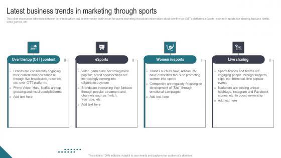 This slide showcases difference between key trends which can be referred by businesses for sports marketing. It provides information about over the top OTT platforms, eSports, women in sports, live sharing, fanbase, Netflix, video games, etc. Explore a selection of the finest Latest Business Trends In Marketing Through Sports In Depth Campaigning Guide Diagrams PDF here. With a plethora of professionally designed and pre-made slide templates, you can quickly and easily find the right one for your upcoming presentation. You can use our Latest Business Trends In Marketing Through Sports In Depth Campaigning Guide Diagrams PDF to effectively convey your message to a wider audience. Slidegeeks has done a lot of research before preparing these presentation templates. The content can be personalized and the slides are highly editable. Grab templates today from Slidegeeks. This slide showcases difference between key trends which can be referred by businesses for sports marketing. It provides information about over the top OTT platforms, eSports, women in sports, live sharing, fanbase, Netflix, video games, etc.