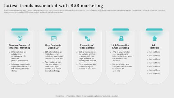 The following slide showcases some of the top and emerging business to business B2B trends that companies need to keep in mind before implementing marketing strategies. The trends are related to influencer marketing, search engine optimization SEO, video content, and email marketing campaign. This Latest Trends Associated With B2B Innovative Business Promotion Ideas Formats Pdf from Slidegeeks makes it easy to present information on your topic with precision. It provides customization options, so you can make changes to the colors, design, graphics, or any other component to create a unique layout. It is also available for immediate download, so you can begin using it right away. Slidegeeks has done good research to ensure that you have everything you need to make your presentation stand out. Make a name out there for a brilliant performance. The following slide showcases some of the top and emerging business to business B2B trends that companies need to keep in mind before implementing marketing strategies. The trends are related to influencer marketing, search engine optimization SEO, video content, and email marketing campaign.