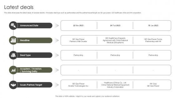 This slide showcases the latest deals of General electric. It includes deal type such as partnerships and the partner Issuer target are GE gas power, GE healthcare china and IHI corporation. The best PPT templates are a great way to save time, energy, and resources. Slidegeeks have 100 percent editable powerpoint slides making them incredibly versatile. With these quality presentation templates, you can create a captivating and memorable presentation by combining visually appealing slides and effectively communicating your message. Download Latest Deals Global Energy Company Profile PPT Example CP SS V from Slidegeeks and deliver a wonderful presentation. This slide showcases the latest deals of General electric. It includes deal type such as partnerships and the partner Issuer target are GE gas power, GE healthcare china and IHI corporation.