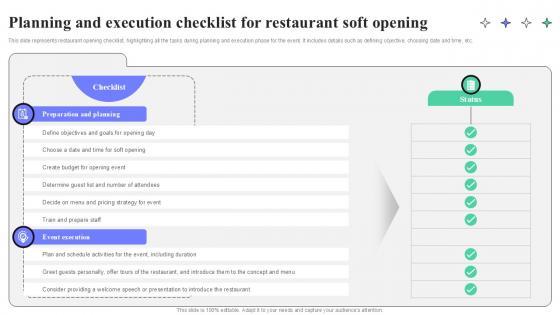 This slide represents restaurant opening checklist, highlighting all the tasks during planning and execution phase for the event. It includes details such as defining objective, choosing date and time, etc. Welcome to our selection of the Planning And Execution Checklist For Restaurant Soft Opening Strategic Guide To Launching Ppt Template. These are designed to help you showcase your creativity and bring your sphere to life. Planning and Innovation are essential for any business that is just starting out. This collection contains the designs that you need for your everyday presentations. All of our PowerPoints are 100Percent editable, so you can customize them to suit your needs. This multi-purpose template can be used in various situations. Grab these presentation templates today. This slide represents restaurant opening checklist, highlighting all the tasks during planning and execution phase for the event. It includes details such as defining objective, choosing date and time, etc.