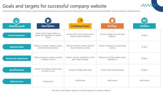 Following slide exhibits plan of company to set and achieve website goals to assure successful launch. It include goals such as brand awareness, website traffic, onsite user experience, qualified leads etc. Crafting an eye-catching presentation has never been more straightforward. Let your presentation shine with this tasteful yet straightforward Complete Guide To Launch Goals And Targets For Successful Company Website template. It offers a minimalistic and classy look that is great for making a statement. The colors have been employed intelligently to add a bit of playfulness while still remaining professional. Construct the ideal Complete Guide To Launch Goals And Targets For Successful Company Website that effortlessly grabs the attention of your audience Begin now and be certain to wow your customers Following slide exhibits plan of company to set and achieve website goals to assure successful launch. It include goals such as brand awareness, website traffic, onsite user experience, qualified leads etc.