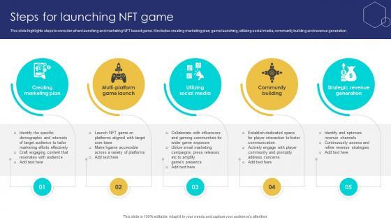 This slide highlights steps to consider when launching and marketing NFT based game. It includes creating marketing plan, game launching, utilizing social media, community building and revenue generation. The Unlocking The Potential Of Steps For Launching Nft Game BCT SS V is a compilation of the most recent design trends as a series of slides. It is suitable for any subject or industry presentation, containing attractive visuals and photo spots for businesses to clearly express their messages. This template contains a variety of slides for the user to input data, such as structures to contrast two elements, bullet points, and slides for written information. Slidegeeks is prepared to create an impression. This slide highlights steps to consider when launching and marketing NFT based game. It includes creating marketing plan, game launching, utilizing social media, community building and revenue generation.