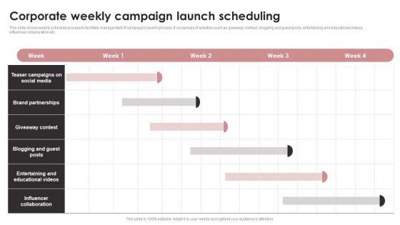 This slide shows weekly schedule process to facilitate management of campaigns launch process. It comprises of activities such as giveaway contest, blogging and guest posts, entertaining and educational videos, influencer collaboration etc. Showcasing this set of slides titled Corporate Weekly Campaign Launch Scheduling Infographics Pdf. The topics addressed in these templates are Brand Partnerships, Influencer Collaboration, Social Media. All the content presented in this PPT design is completely editable. Download it and make adjustments in color, background, font etc. as per your unique business setting. This slide shows weekly schedule process to facilitate management of campaigns launch process. It comprises of activities such as giveaway contest, blogging and guest posts, entertaining and educational videos, influencer collaboration etc.