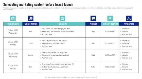 This slide showcases schedule that can be used by organization to distribute content on different media platforms for brand awareness. Its key elements are publish date, content type, content, author, time of posting and media channels From laying roadmaps to briefing everything in detail, our templates are perfect for you. You can set the stage with your presentation slides. All you have to do is download these easy-to-edit and customizable templates. Scheduling Marketing Content Before Brand Launch Launching New Product Brand Formats Pdf will help you deliver an outstanding performance that everyone would remember and praise you for. Do download this presentation today. This slide showcases schedule that can be used by organization to distribute content on different media platforms for brand awareness. Its key elements are publish date, content type, content, author, time of posting and media channels