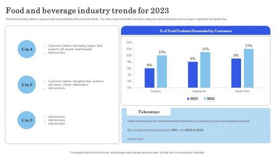 The following slide outlines a diagrammatic representation of food industry trends. The slide covers information about the categories of food products such as organic, vegetarian and gluten-free. Are you searching for a Food And Beverage Industry Trends For 2023 Launching New Beverage Product Information PDF that is uncluttered, straightforward, and original Its easy to edit, and you can change the colors to suit your personal or business branding. For a presentation that expresses how much effort you ve put in, this template is ideal With all of its features, including tables, diagrams, statistics, and lists, its perfect for a business plan presentation. Make your ideas more appealing with these professional slides. Download Food And Beverage Industry Trends For 2023 Launching New Beverage Product Information PDF from Slidegeeks today.