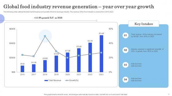 The following slide outlines the total market revenue and growth of food beverage industry. The revenue of the food industry is covered from 2015-2022. Slidegeeks has constructed Global Food Industry Revenue Generation Year Over Year Growth Launching New Beverage Product Themes PDF after conducting extensive research and examination. These presentation templates are constantly being generated and modified based on user preferences and critiques from editors. Here, you will find the most attractive templates for a range of purposes while taking into account ratings and remarks from users regarding the content. This is an excellent jumping-off point to explore our content and will give new users an insight into our top-notch PowerPoint Templates.