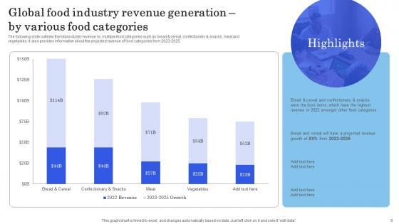 The following slide outlines the total industry revenue by multiple food categories such as bread cereal, confectionery snacks, meat and vegetables. It also provides information about the projected revenue of food categories from 2023-2025. Retrieve professionally designed Global Food Industry Revenue Generation By Various Food Categories Launching New Beverage Product Information PDF to effectively convey your message and captivate your listeners. Save time by selecting pre-made slideshows that are appropriate for various topics, from business to educational purposes. These themes come in many different styles, from creative to corporate, and all of them are easily adjustable and can be edited quickly. Access them as PowerPoint templates or as Google Slides themes. You do not have to go on a hunt for the perfect presentation because Slidegeeks got you covered from everywhere.