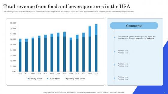 The following slide outlines the industry sales generated from various type of food and beverage stores in the USA. It covers information about the grocery, liquor and specialty food stores. Boost your pitch with our creative Launching New Commodity Total Revenue From Food And Beverage Stores In The Usa Brochure Pdf Deliver an awe-inspiring pitch that will mesmerize everyone. Using these presentation templates you will surely catch everyones attention. You can browse the ppts collection on our website. We have researchers who are experts at creating the right content for the templates. So you do not have to invest time in any additional work. Just grab the template now and use them. The following slide outlines the industry sales generated from various type of food and beverage stores in the USA. It covers information about the grocery, liquor and specialty food stores.