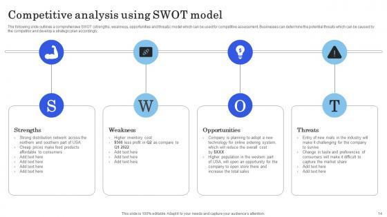 The following slide outlines a comprehensive SWOT strengths, weakness, opportunities and threats model which can be used for competitive assessment. Businesses can determine the potential threats which can be caused by the competitor and develop a strategic plan accordingly.Make sure to capture your audiences attention in your business displays with our gratis customizable Competitive Analysis Using Swot Model Launching New Beverage Product Introduction PDF. These are great for business strategies, office conferences, capital raising or task suggestions. If you desire to acquire more customers for your tech business and ensure they stay satisfied, create your own sales presentation with these plain slides.