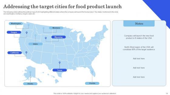 The following slide outlines the political map of USA highlighting different states where the company will launch the food product. The states mentioned in the slide are Washington, Montana, Oregon, Idaho etc. If your project calls for a presentation, then Slidegeeks is your go-to partner because we have professionally designed, easy-to-edit templates that are perfect for any presentation. After downloading, you can easily edit Addressing The Target Cities For Food Product Launch Launching New Beverage Product Ideas PDF and make the changes accordingly. You can rearrange slides or fill them with different images. Check out all the handy templates.