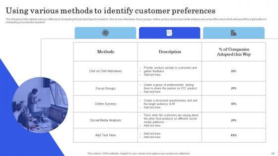 The following slide outlines various methods of conducting food product launch research. One on one interviews, focus groups, online surveys and social media analysis are some of the ways which will assist the organization in conducting a successful research. Explore a selection of the finest Using Various Methods To Identify Customer Preferences Launching New Beverage Product Designs PDF here. With a plethora of professionally designed and pre-made slide templates, you can quickly and easily find the right one for your upcoming presentation. You can use our Using Various Methods To Identify Customer Preferences Launching New Beverage Product Designs PDF to effectively convey your message to a wider audience. Slidegeeks has done a lot of research before preparing these presentation templates. The content can be personalized and the slides are highly editable. Grab templates today from Slidegeeks.