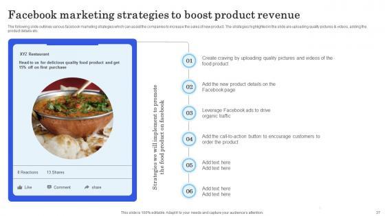 The following slide outlines various facebook marketing strategies which can assist the companies to increase the sales of new product. The strategies highlighted in the slide are uploading quality pictures and videos, adding the product details etc. The best PPT templates are a great way to save time, energy, and resources. Slidegeeks have 100 precent editable powerpoint slides making them incredibly versatile. With these quality presentation templates, you can create a captivating and memorable presentation by combining visually appealing slides and effectively communicating your message. Download Facebook Marketing Strategies To Boost Product Revenue Launching New Beverage Product Designs PDF from Slidegeeks and deliver a wonderful presentation.