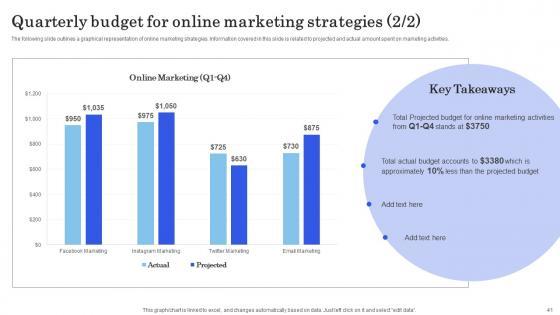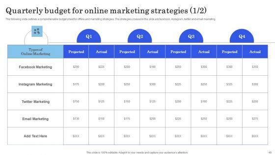 The following slide outlines a comprehensible budget sheet for offline and marketing strategies. The strategies covered in the slide are facebook, Instagram, twitter and email marketing.Slidegeeks is here to make your presentations a breeze with Quarterly Budget For Online Marketing Strategies Launching New Beverage Product Icons PDF With our easy-to-use and customizable templates, you can focus on delivering your ideas rather than worrying about formatting. With a variety of designs to choose from, you are sure to find one that suits your needs. And with animations and unique photos, illustrations, and fonts, you can make your presentation pop. So whether you are giving a sales pitch or presenting to the board, make sure to check out Slidegeeks first.