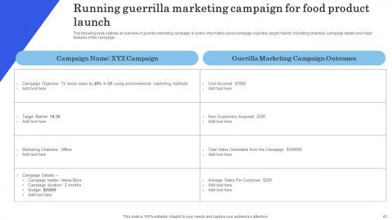 The following slide outlines an overview of guerilla marketing campaign. It covers information about campaign objective, target market, marketing channels, campaign details and major features of the campaign. Whether you have daily or monthly meetings, a brilliant presentation is necessary. Running Guerrilla Marketing Campaign For Food Product Launch Launching New Beverage Product Portrait PDF can be your best option for delivering a presentation. Represent everything in detail using Running Guerrilla Marketing Campaign For Food Product Launch Launching New Beverage Product Portrait PDF and make yourself stand out in meetings. The template is versatile and follows a structure that will cater to your requirements. All the templates prepared by Slidegeeks are easy to download and edit. Our research experts have taken care of the corporate themes as well. So, give it a try and see the results.