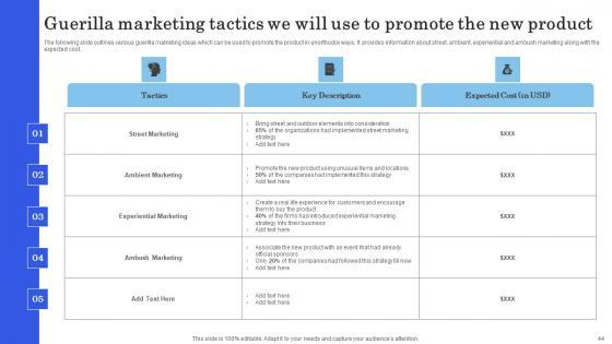 The following slide outlines various guerilla marketing ideas which can be used to promote the product in unorthodox ways. It provides information about street, ambient, experiential and ambush marketing along with the expected cost.Presenting this PowerPoint presentation, titled Guerilla Marketing Ideas To Promote The New Product Launching New Beverage Product Elements PDF, with topics curated by our researchers after extensive research. This editable presentation is available for immediate download and provides attractive features when used. Download now and captivate your audience. Presenting this Guerilla Marketing Ideas To Promote The New Product Launching New Beverage Product Elements PDF. Our researchers have carefully researched and created these slides with all aspects taken into consideration. This is a completely customizable Guerilla Marketing Ideas To Promote The New Product Launching New Beverage Product Elements PDF that is available for immediate downloading. Download now and make an impact on your audience. Highlight the attractive features available with our PPTs.