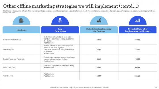 The following slide outlines different offline marketing strategies which can assist the companies in expanding the market reach. The key strategies are sending out press release, offering coupons, creating flyers and pamphlets and making cold calls.There are so many reasons you need a Other Offline Marketing Strategies We Will Implement Launching New Beverage Product Clipart PDF. The first reason is you can not spend time making everything from scratch, Thus, Slidegeeks has made presentation templates for you too. You can easily download these templates from our website easily.
