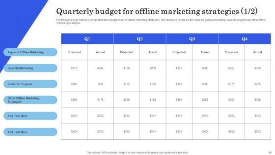 The following slide outlines a comprehensible budget sheet for offline marketing strategies. The strategies covered in the slide are guerilla marketing, rewards program and other offline marketing strategies.Present like a pro with Quarterly Budget For Offline Marketing Strategies Launching New Beverage Product Formats PDF Create beautiful presentations together with your team, using our easy-to-use presentation slides. Share your ideas in real-time and make changes on the fly by downloading our templates. So whether you are in the office, on the go, or in a remote location, you can stay in sync with your team and present your ideas with confidence. With Slidegeeks presentation got a whole lot easier. Grab these presentations today.