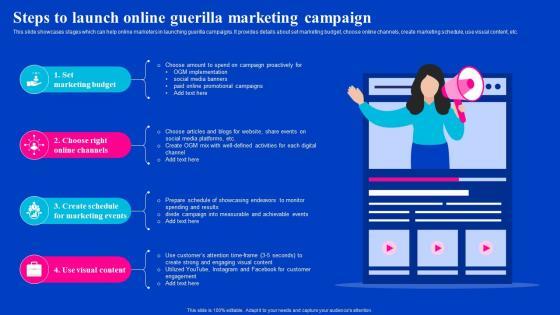 This slide showcases stages which can help online marketers in launching guerilla campaigns. It provides details about set marketing budget, choose online channels, create marketing schedule, use visual content, etc. Present like a pro with Steps To Launch Online Guerilla Marketing Campaign Viral Video Outreach Plan Microsoft Pdf Create beautiful presentations together with your team, using our easy-to-use presentation slides. Share your ideas in real-time and make changes on the fly by downloading our templates. So whether you are in the office, on the go, or in a remote location, you can stay in sync with your team and present your ideas with confidence. With Slidegeeks presentation got a whole lot easier. Grab these presentations today. This slide showcases stages which can help online marketers in launching guerilla campaigns. It provides details about set marketing budget, choose online channels, create marketing schedule, use visual content, etc.