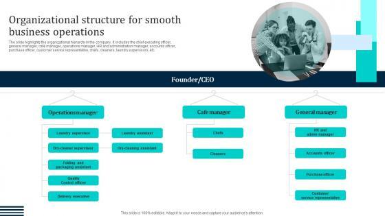 The slide highlights the organizational hierarchy in the company. It includes the chief executing officer, general manager, cafe manager, operations manager, HR and administration manager, accounts officer, purchase officer, customer service representative, chefs, cleaners, laundry supervisors, etc.Are you searching for a Organizational Structure For Smooth Business Laundromat Business Plan Go To Market Professional Pdf that is uncluttered, straightforward, and original Its easy to edit, and you can change the colors to suit your personal or business branding. For a presentation that expresses how much effort you have put in, this template is ideal. With all of its features, including tables, diagrams, statistics, and lists, its perfect for a business plan presentation. Make your ideas more appealing with these professional slides. Download Organizational Structure For Smooth Business Laundromat Business Plan Go To Market Professional Pdf from Slidegeeks today. The slide highlights the organizational hierarchy in the company. It includes the chief executing officer, general manager, cafe manager, operations manager, HR and administration manager, accounts officer, purchase officer, customer service representative, chefs, cleaners, laundry supervisors, etc.