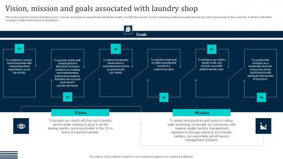 This slide covers the laundry industrys vision, mission, and goals to ensure that it will deliver healthy and effective laundry and dry-cleaning solutions meant to provide top-notch experiences to the customer. It will also reflect the companys culture and reason for operations.Create an editable Vision Mission And Goals Associated Laundromat Business Plan Go To Market Designs Pdf that communicates your idea and engages your audience. Whether you are presenting a business or an educational presentation, pre-designed presentation templates help save time. Vision Mission And Goals Associated Laundromat Business Plan Go To Market Designs Pdf is highly customizable and very easy to edit, covering many different styles from creative to business presentations. Slidegeeks has creative team members who have crafted amazing templates. So, go and get them without any delay. This slide covers the laundry industrys vision, mission, and goals to ensure that it will deliver healthy and effective laundry and dry cleaning solutions meant to provide top notch experiences to the customer. It will also reflect the companys culture and reason for operations.