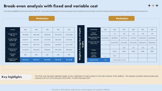 Create an editable Break Even Analysis With Fixed And Variable On Demand Laundry Business Plan Diagrams Pdf that communicates your idea and engages your audience. Whether you are presenting a business or an educational presentation, pre designed presentation templates help save time. Break Even Analysis With Fixed And Variable On Demand Laundry Business Plan Diagrams Pdf is highly customizable and very easy to edit, covering many different styles from creative to business presentations. Slidegeeks has creative team members who have crafted amazing templates. So, go and get them without any delay. The slides highlight the break even analysis of the firm. This analysis estimates the minimum revenue volume required to cover the fixed cost of the business. Below this point, the company will make a financial loss.