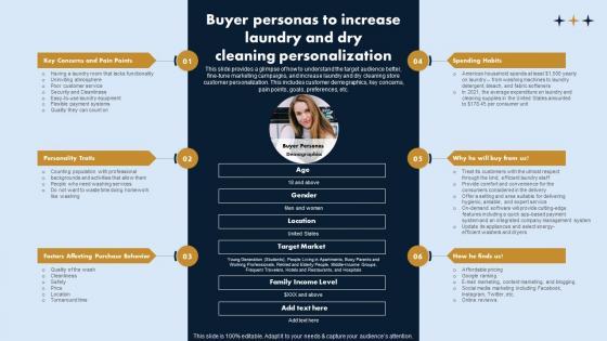 Slidegeeks is one of the best resources for PowerPoint templates. You can download easily and regulate Buyer Personas To Increase Laundry On Demand Laundry Business Plan Themes Pdf for your personal presentations from our wonderful collection. A few clicks is all it takes to discover and get the most relevant and appropriate templates. Use our Templates to add a unique zing and appeal to your presentation and meetings. All the slides are easy to edit and you can use them even for advertisement purposes. This slide provides a glimpse of how to understand the target audience better, fine tune marketing campaigns, and increase laundry and dry cleaning store customer personalization. This includes customer demographics, key concerns, pain points, goals, preferences, etc.