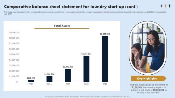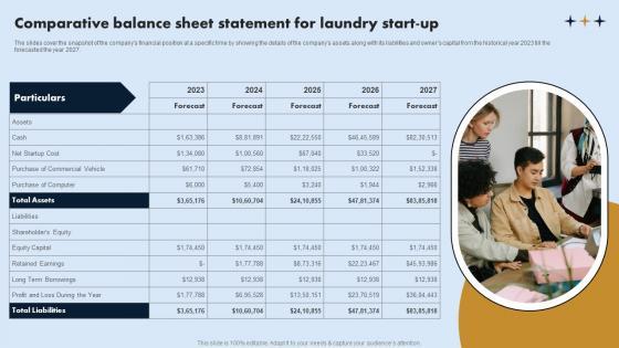 Want to ace your presentation in front of a live audience Our Comparative Balance Sheet Statement On Demand Laundry Business Plan Topics Pdf can help you do that by engaging all the users towards you.. Slidegeeks experts have put their efforts and expertise into creating these impeccable powerpoint presentations so that you can communicate your ideas clearly. Moreover, all the templates are customizable, and easy to edit and downloadable. Use these for both personal and commercial use. The slides cover the snapshot of the companys financial position at a specific time by showing the details of the companys assets along with its liabilities and owners capital from the historical year 2023 till the forecasted the year 2027.
